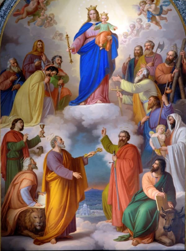 El salesiano Jordi Latorre explica así la conocida pintura. “En el centro de cuadro aparece la Virgen María con el niño Jesús en brazos. A su alrededor están representados también el grupo de los Apóstoles, entre los que sobresalen san Pedro y san Pablo, los cuatro evangelistas, y algunos ángeles. Al pie de la Virgen aparece representada la Basílica y parte de la ciudad de Turín. El hecho de estar rodeada de los apóstoles, columna y fundamento de la Iglesia, la comunidad de los discípulos de Jesús, la califica como ‘Madre de la Iglesia’, en palabras del propio Don Bosco”, asegura.