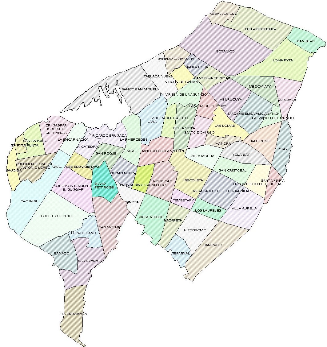 Asunción a diferencia de cualquier otro municipio está organizada territorialmente en seis distritos (Santísima Trinidad, La Recoleta, San Roque, La Catedral, La Encarnación y Santa María de la Asunción) y estos a su vez se dividen en 68 barrios. Los distritos y los barrios que conforman la ciudad de Asunción son: