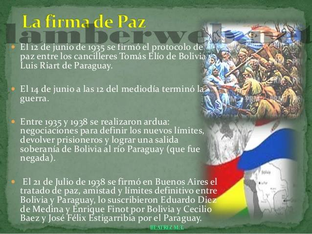 El 14 de junio cesó definitivamente el fuego en todo el frente. El Protocolo de Paz fue aprobado por Paraguay el 20 de junio de 1935, y por Bolivia, al día siguiente. Finalmente, el Tratado de Paz, Amistad y Límites entre Paraguay y Bolivia se firmó el 21 de julio de 1938, en Buenos Aires, donde el país recuperó alrededor de 154.000 kilómetros cuadrados de territorio detentado por Bolivia.
